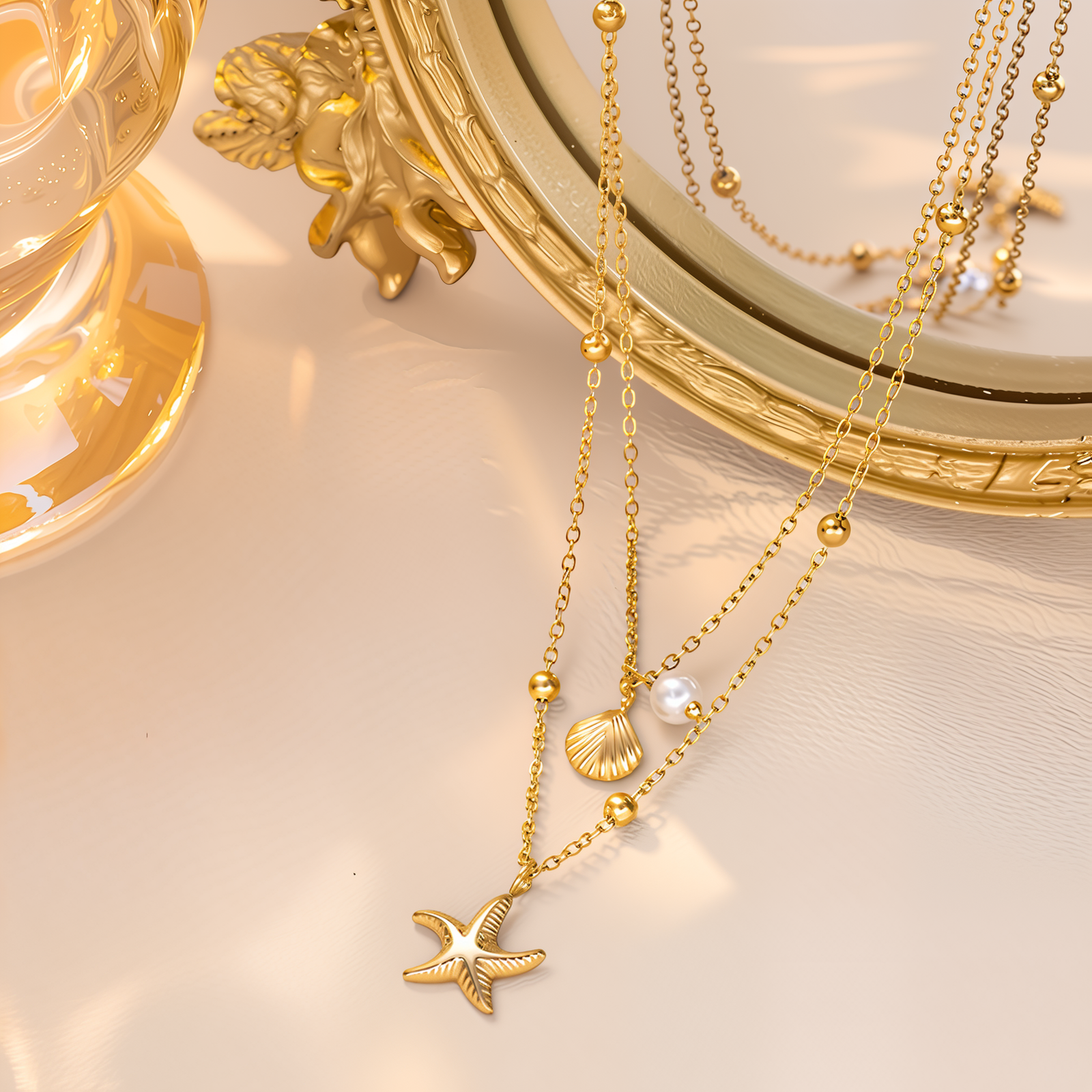 Beach Theme Layer Necklace | Shell Starfish Pearl Necklace